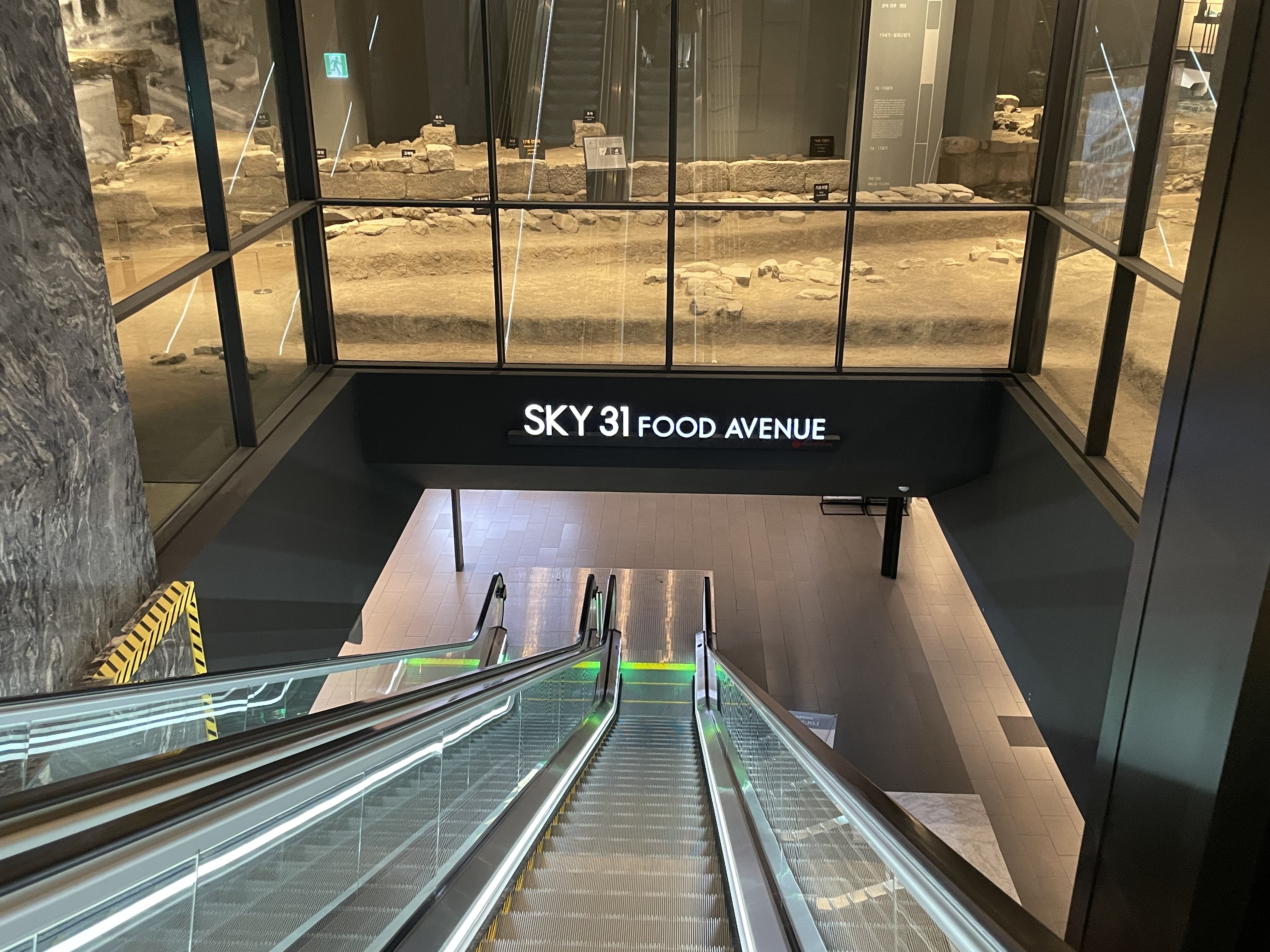 에스컬레이터를 탑승하게 되면 한번에 1층에서 지하 2층으로 내려오게 됩니다. 중간에 보이는 건 아마도 건물 공사하다가 발견된 것으로 추정되는데요. 공평도시유적전시관 입니다. 11월부터 거리두기 완화에 따라서 예약 없이 이용 가능하다고 해요.
