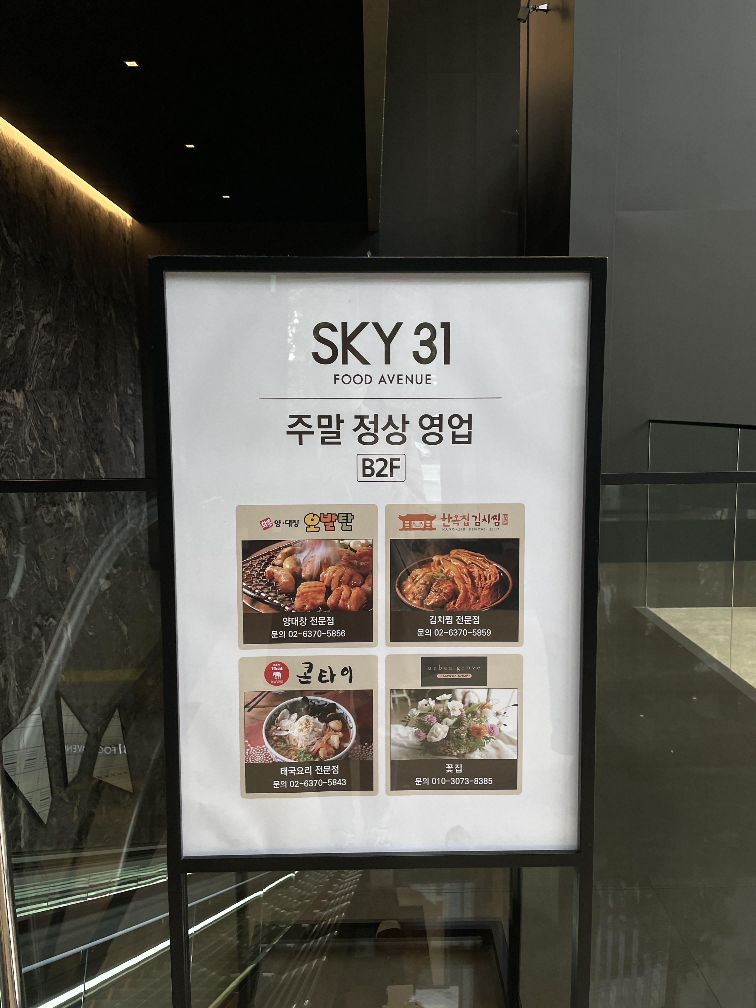 저는 지하에 있는 SKY31 FOOD AVENUE를 가려고 하는데 바로 왼쪽에 내려가는 에스컬레이터 앞에 주말에 영업하는 가게 이름들이 적혀 있어요. 오발탄, 한옥집 김치찜, 콘타이, 어반그로브만 정상 영업하고 있습니다. 아무래도 직장인이 많은 상권이다 보니 주말에 닫는 가게들도 많은 것 같았어요.