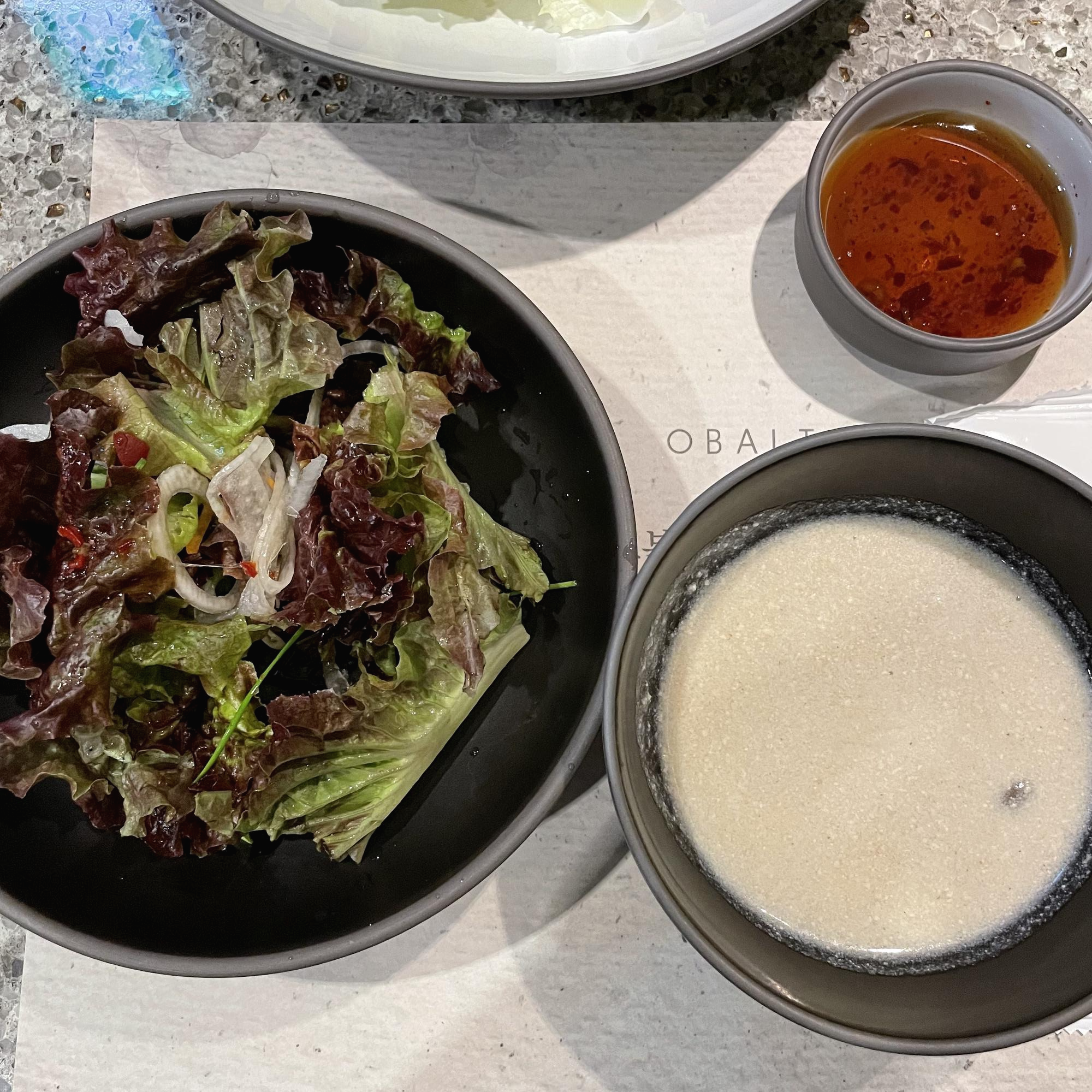 한 사람씩 앞에 주셨던 야채와 들깨죽(?) 입니다. 안에 버섯이 들어가 있고 깔끔한 맛이었어요.