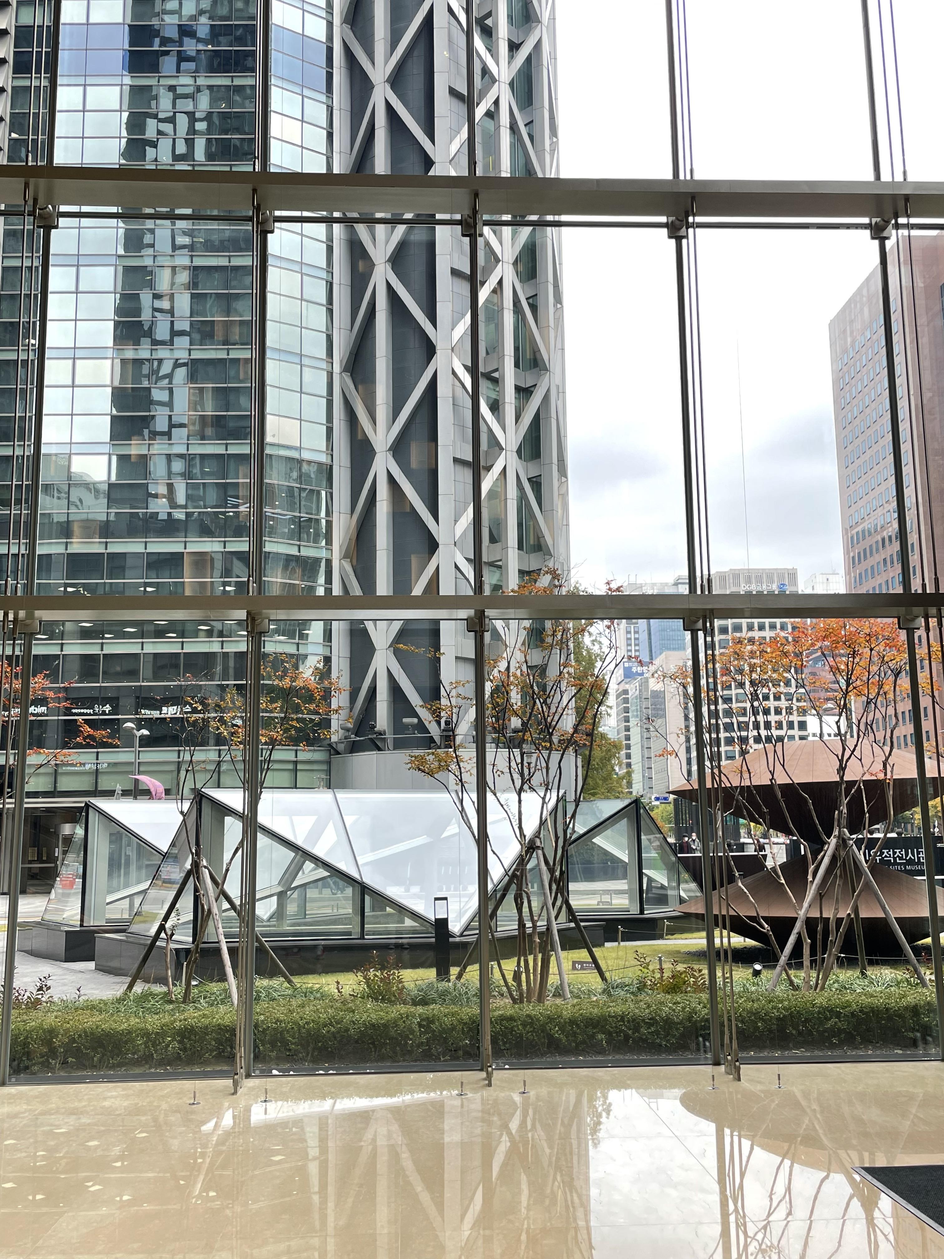 1층 로비에서 보면 이런 느낌이에요. 이 건물은 독특하게 에스컬레이터를 타고 한 층 올라가야 진짜 로비가 있더라고요. 거기서 기다리는 공간도 있고 건물 안으로 출입할 수 있는 입구가 나옵니다.